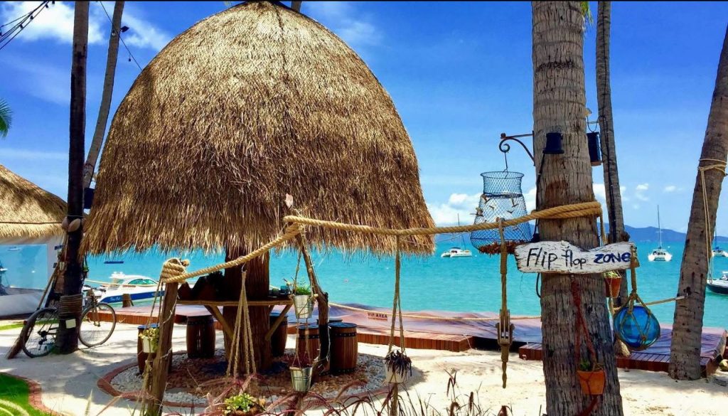 Style: Iconic beachfront chill with beanbags, cocktails, and fire shows